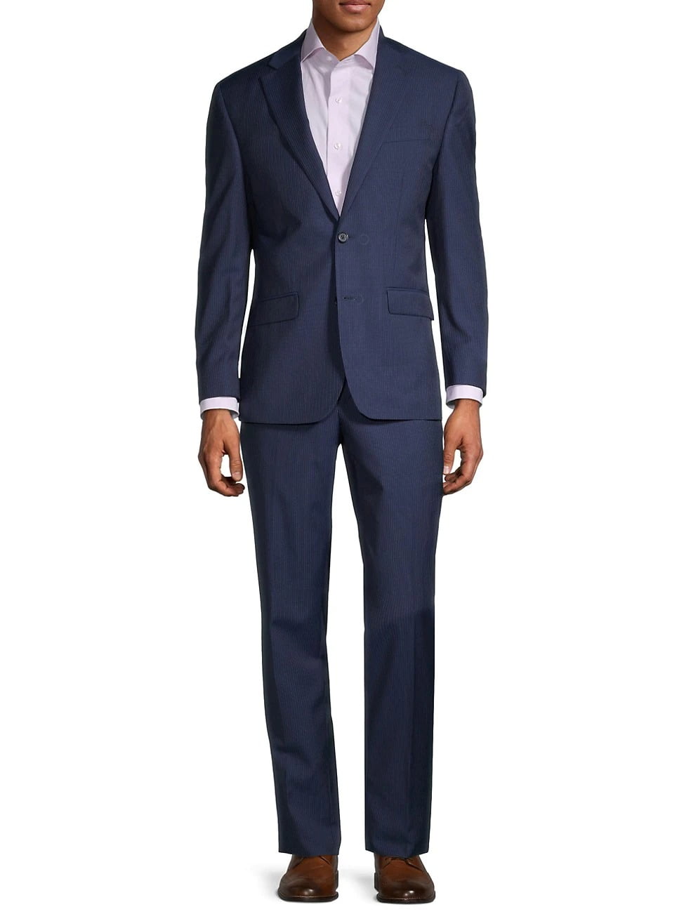 Classic suit in a pinstriped pattern is cut from wool-blend. Wool/polyester. Dry clean. Imported.