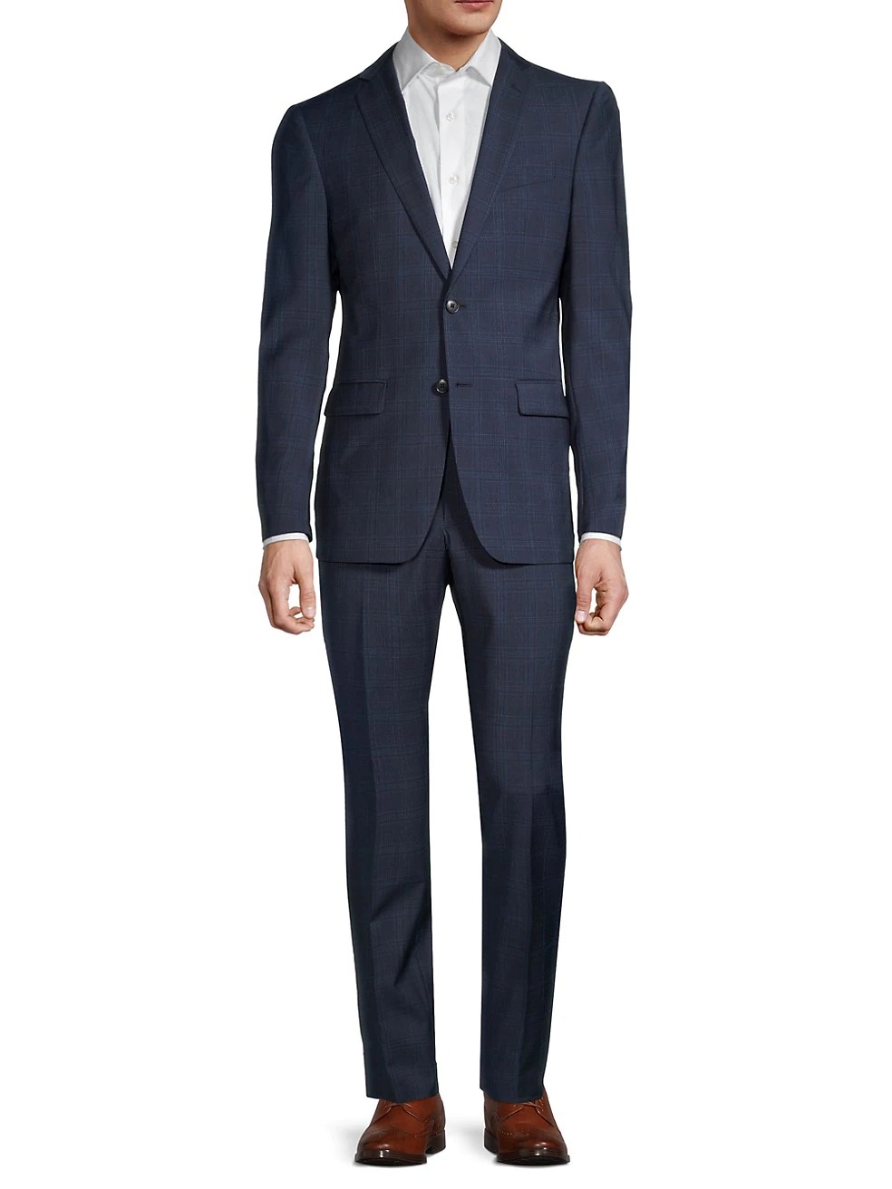 Windowpane checks give this wool suit a contemporary style. Lined. Wool. Dry clean. Imported.