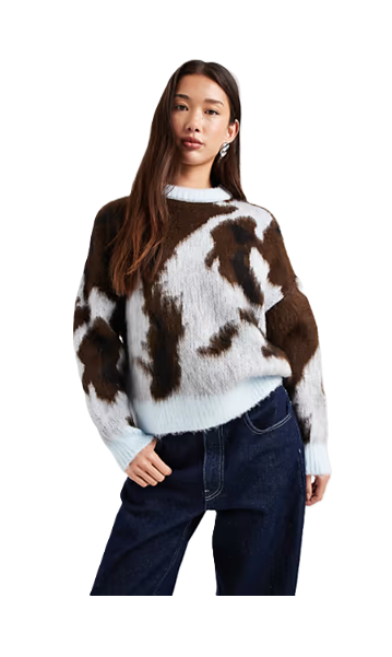 Hey, sweater lovers! Check out this fabulous Abstract Brushed Cow Jacquard Sweater in Blue and Brown, perfect for adding a fun twist to your wardrobe. At just $60, it's a steal for a cozy upgrade! With its unique cow print, you'll feel like a fashion icon straight from the countryside-minus the hay and mooing, of course. Whatโs even sweeter? This beauty ships for free. So whether you're binge-watching your favorite series or out chasing after your munchkins, this comfy sweater has got your back. Seriously, treat yourself and grab this deal before it trots away!Want more? Here are some similar deals Oversized Sweater in Brown and Black Diamond Print for $63 and this Sweater with Collar for $34. For more deals on Women's Sweaters click here.