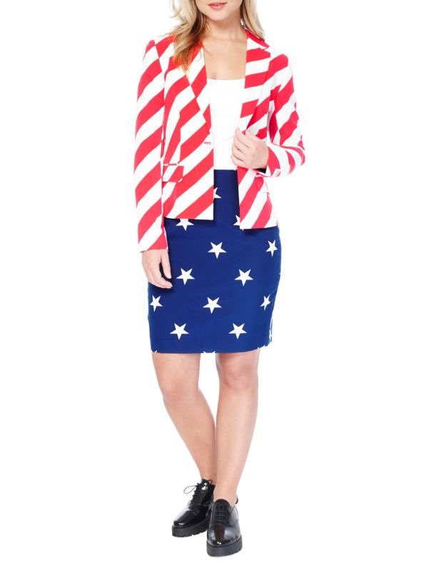 From the Women's Collection. Be vocal about the love for your nation donning this striped jacket and star-printed skirt. The stars and striped skirt suit will turn into your go-to formalwear in no time. Polyester lining. Polyester. Machine wash. Imported. JACKET