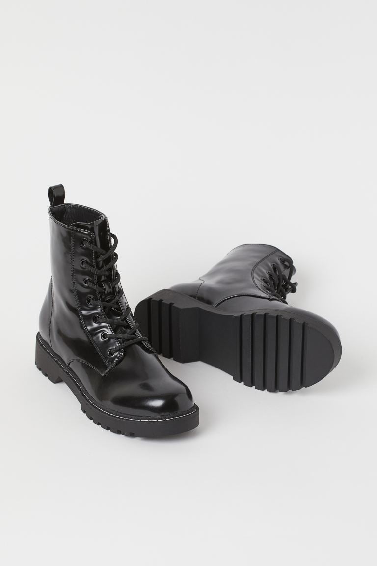 Warm-lined ankle-length boots in shiny faux leather. Lacing at front and loop at back. Fabric lining, fabric insoles, and chunky soles. Heel height 1 1/4 in.