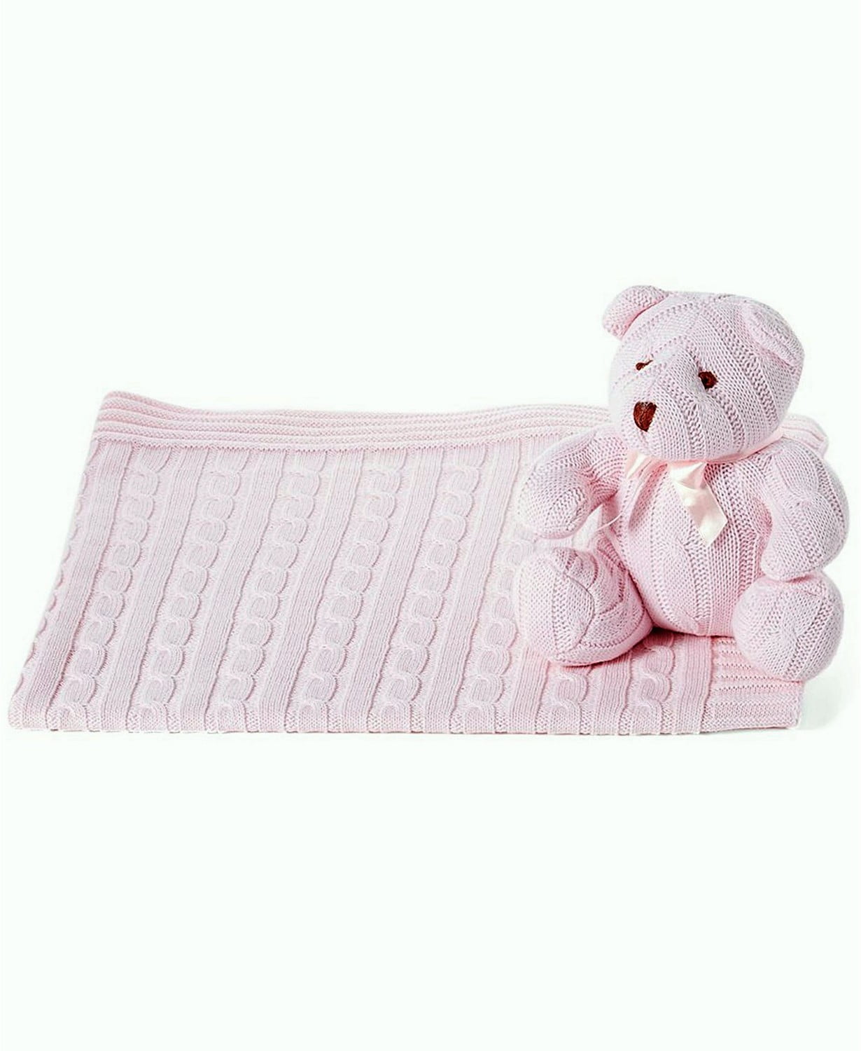 What a nice, soft pair This 100% cable knit combination will be a perfect gift for the new baby. The cable knit teddy bear is so cute and the matching blanket is a layette necessity. Comes in gift box, ready to giving.