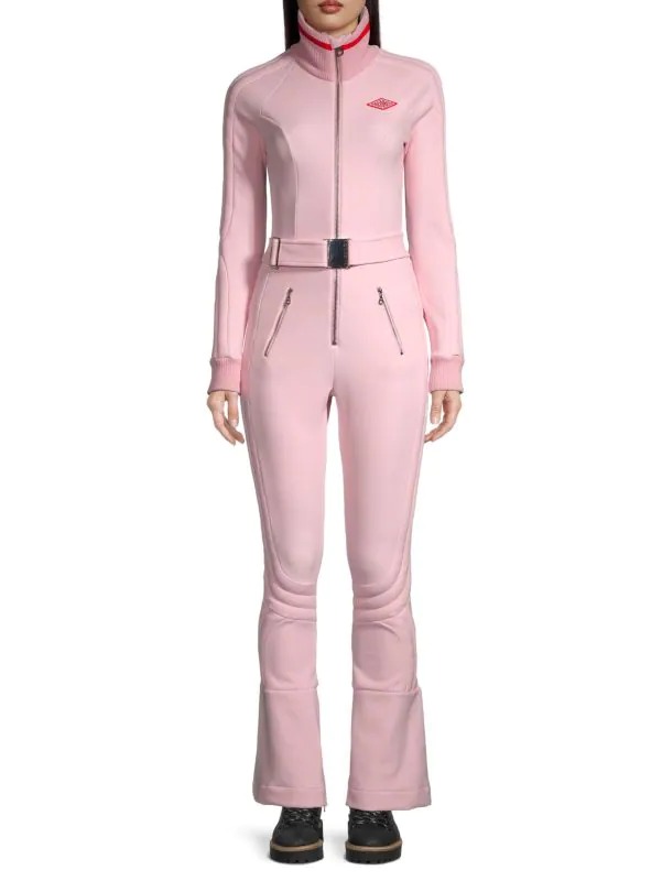 Blending fashion and function, this ski suit features a waterproof shell with four-way stretch in a 70s-inspired silhouette.