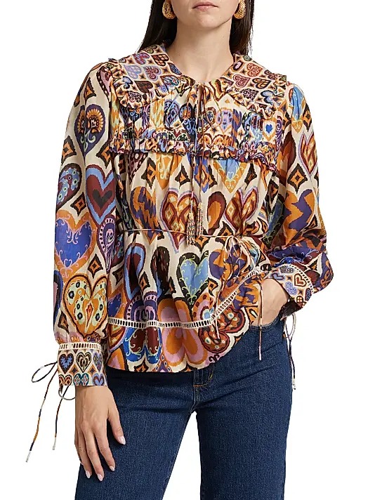Listen up, fashionistas! If your closet is starting to look like a fashion no-man's land, it's time to snag this Hearts Ikat-inspired Blouse from Farm Rio. For just $82, you're getting a serious upgrade from its original price of $220. Talk about a deal that's hotter than a summer sidewalk! This piece is perfect for adding a pop of flair to any outfit, whether you're heading to brunch or just strutting around the house. Plus, it ships for free, so your wallet can breathe a sigh of relief. Trust me, your wardrobe will thank you for bringing this beauty home. Donβt let this one slip away!Like this deal? Here are some like ones Essentials Oversized T-shirt for $30 and this Seamless Zaia Long Sleeve Active Shirt with Thumbholes for $12. If you like deals and sales on Farm Rio Women's Tops, follow us on Instagram to get notified of the latest deals! For more deals on Women's Tops click here.