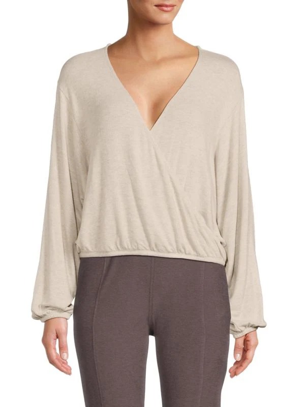 Super deal! Get Heathered Dropped Shoulder Wrap Top for only $50! That's 43% off regular price! Get it while it's hot!
