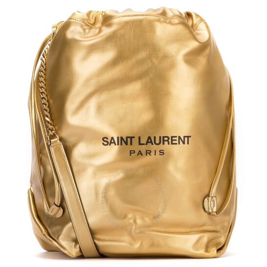 Saint Laurent Ladies Bucket Bag. Teddy series. SKU: 538447 1DN3W 8061. Color: Gold. Size: 8.2" x 12.5" x 8.6". Saint Laurent Ladies Teddy Drawstring Bucket Bag. Crafted in leather, this bag from Saint Laurent features a drawstring fastening, leather reinforced curb chain shoulder strap, 1 envelope pocket inside with a snap fastening and a gold-toned metal hardware. Made in Italy.