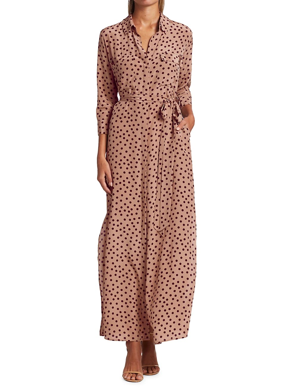 Playful polka dots accent this belted maxi shirtdress while a luxe silk fabrication finishes with an airy feel.