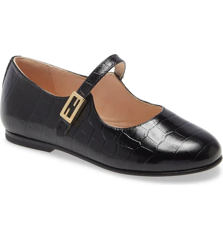A classically sweet mary jane gets a couture makeover in croc-embossed leather with a decorative double-F buckle at the elasticized strap. Toddler: 2-4 yrs., Little Kid: 4-8 yrs., Big Kid: 8-12 yrs.