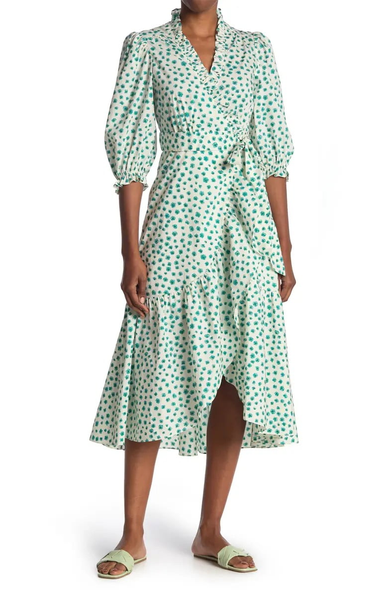 A deep V-neck lets you layer this puff sleeve dress with your favorite camisole. - V-neck - Front wrap closure - Puff sleeves - Daisy print - Ruffle trim - Hi-lo hems - Approx. 45" shortest length, 50" longest length - Imported
