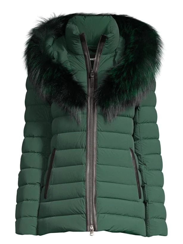 Streamlined channel quilted puffer with silver fox fur-trimmed hood, sleek leather trim and cozy down fill.