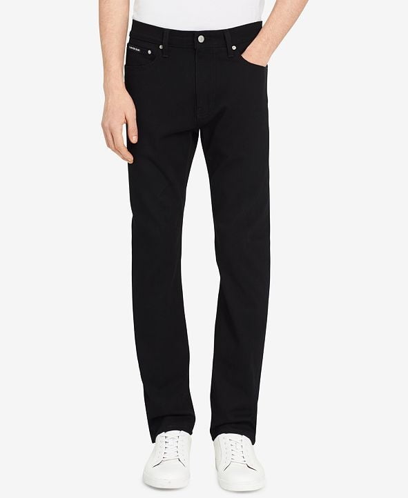 In a black wash, these Calvin Klein jeans feature a straight leg silhouette, five pockets, logo hardware and decorative topstitching.