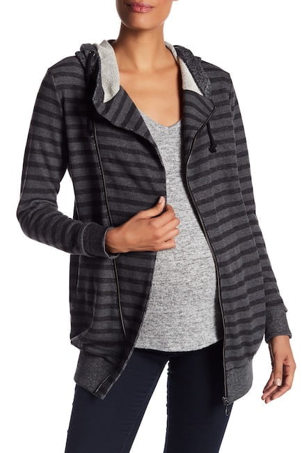 Here's the deal - Get this Momo Maternity Salena Striped Asymmetrical Zip Front Hoodie for only $16.97! That's 78% off regular price! Will sell out fast! For more deals on Maternity click here.'- Attached adjustable hood - Long sleeves with contrast elasticized cuff - Front asymmetrical zip closure - 2 front welt pockets - Stripe pattern throughout - Contrast elasticized hem