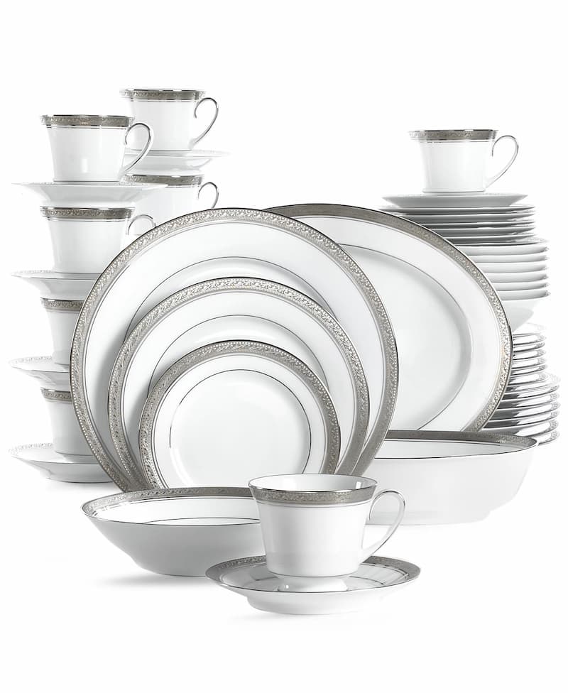 The exquisite craftsmanship of Noritake has transformed formal tables into dazzling displays for more than 100 years. The Crestwood Platinum 50-piece set is a stunning example of porcelain design. Delicate yet durable, each piece is dishwasher safe -- and with service for eight, the set is as affordable as it is elegant. Polished platinum scintillates against dark tablecloths and brings out the sparkle of your best crystal. In crisp white china framed by fine foliage details, the pattern can even do double duty at family dinners and formal occasions.