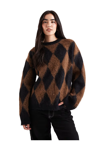 Hey, sweater lovers, gather around! This Oversized Sweater in Brown and Black Diamond Print is not just your average cozy gear; it's like being wrapped in a warm hug while looking effortlessly chic. This beauty is just $63, which is a total steal for such a statement piece. Perfect for those lazy days lounging at home or when you want to look cute while running errands. Plus, you wonβt believe it-shipping is free! So go ahead, treat yourself, and get ready to be the most stylish person at the coffee shop or wherever your day takes you. Your closet will thank you for this women's sweater deal!Here are some similar deals we think you'll enjoy Sweater with Collar for $34 and this Raglan-sleeved Sweater for $42. For more deals on Women's Sweaters click here.