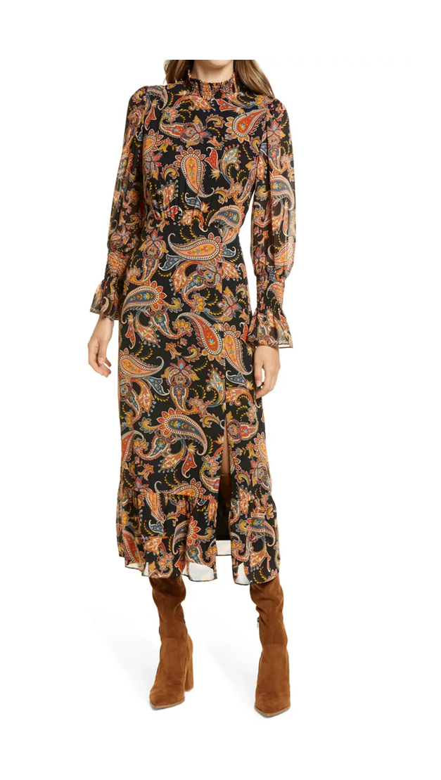 Hey fashionista! If you’re looking for a wardrobe upgrade that won’t break the bank, check out this Paisley Long Sleeve Midi Dress. Priced at just $45, down from $120, you're getting a sweet 63% off! That's like finding a five-dollar bill in an old coat pocket, only way better. This dress offers a stunning design that’s perfect for everything from brunch with the gals to a cozy night in. Slip it on and feel like a total queen, because who doesn’t want to turn heads without turning their wallet inside out? Don't sleep on this deal, it’s too good to let it pass by!Not what you're looking for? Check these out Linen Blend Balloon Sleeve Embroidered Maxi Dress for $60 and this Dressing Room Drama Tiered Maxi Shirtdress for $398. For more deals on Women's Dresses click here.