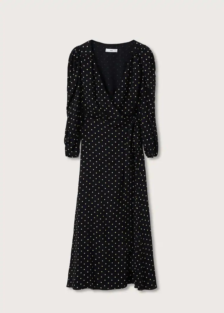 Committed Collection. Satin. Long design. Evasé design. Print. Wrap collar. Long puffed sleeves. Elastic pleated on the waist. Inner lining. Side bow fastening. Plus Size Available. Party collection.