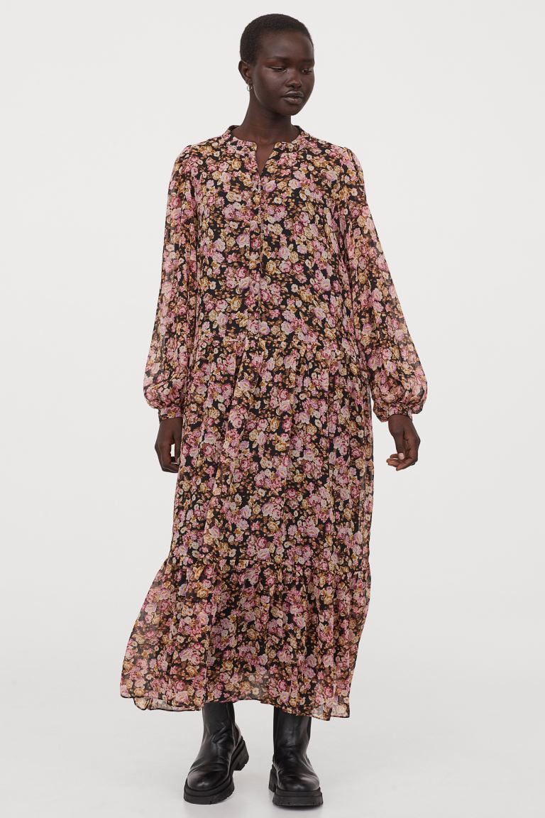 Great deal! Get this Puff-sleeved Chiffon Dress for only $26! That's 48% off regular price! Plus, Puff-sleeved Chiffon Dress ships free! Shop now before it sells out! For more deals on Women's Dresses click here.Calf-length dress in chiffon. Band collar, buttons at top, long, voluminous puff sleeves, and narrow cuffs with button. Gathered seam at waist and on skirt. Jersey lining made from recycled polyester.