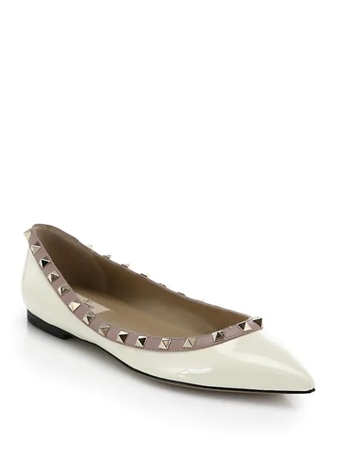Signature metal studs transform this patent leather staple, with contrasting leather trim and an elegant point toe.