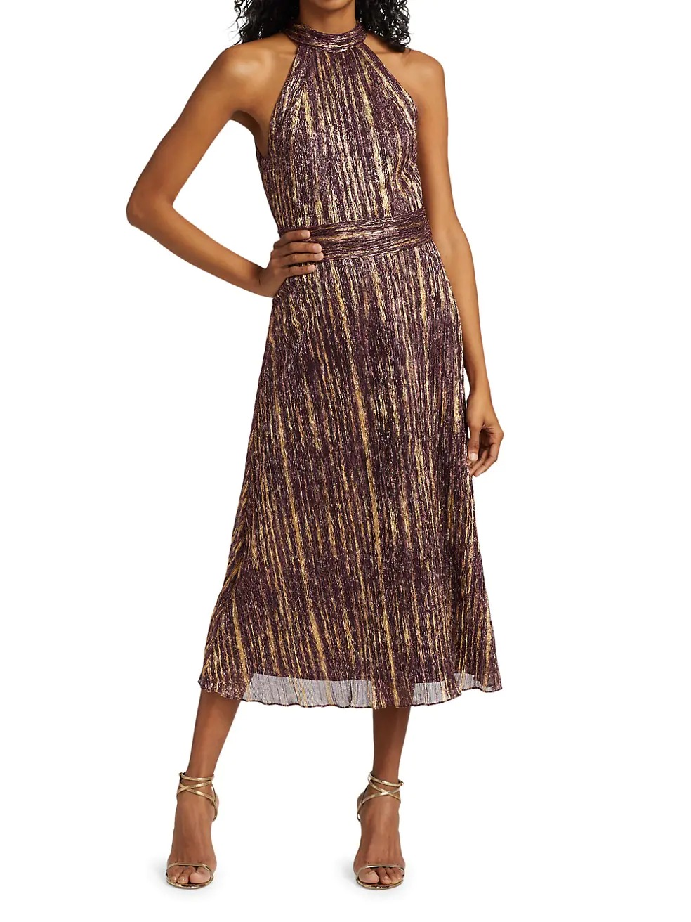 This shimmering two-tone lurex midi dress has a sleeveless hatlerneck cut.