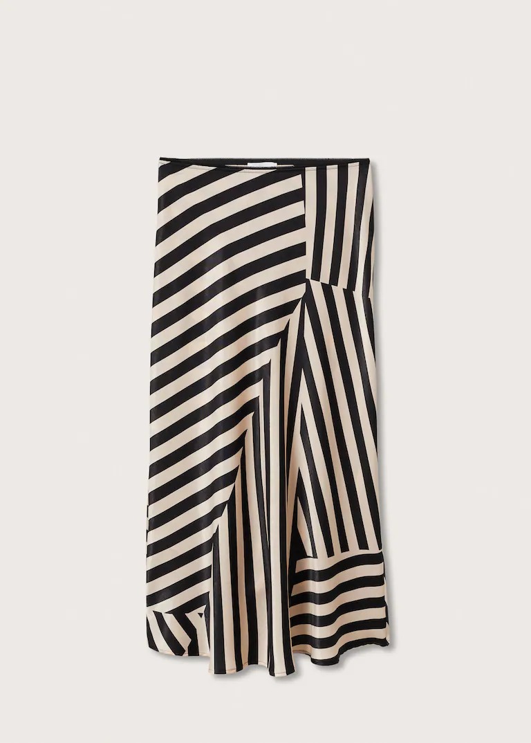 Recycled polyester blend fabric. Satin. Striped print. Evasé design. Midi design. Elastic waist.