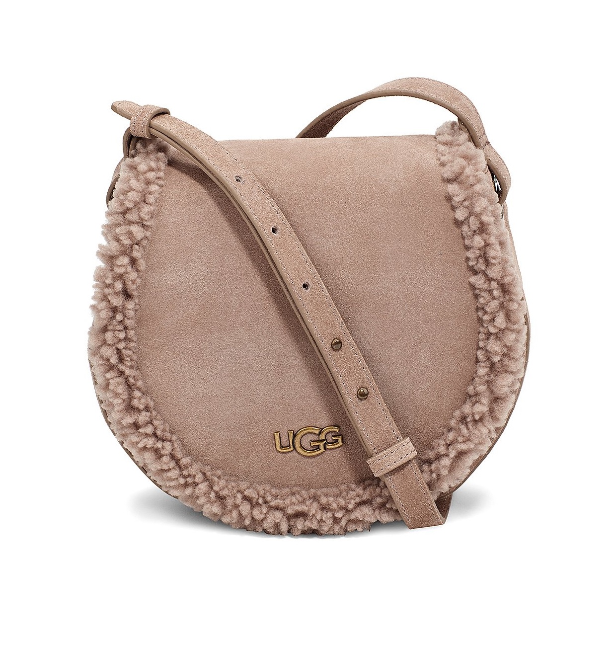Accent your neutral style palette with this smooth, curved crossbody bag made from durable suede and showcasing classic sheepskin trimming for a cozy touch.