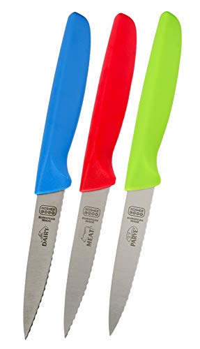 Hey, home chef! If your kitchen is missing some serious slicing power, check out this The Kosher Cook Kitchen Knife 3-piece Set - 4 Inches. These high-quality, color-coded knives come in Dairy Blue, Meat Red, and Parve Green, making sure you never cross those culinary lines. Perfectly engineered for comfort and grip, they make prep feel like a breeze. Plus, at just $30, thatโs a legit steal considering you get three quality tools! Think of it as a gift for your own kitchen or a thoughtful present for a friend. And did I mention it ships free? Your knife drawer just got a serious upgrade!Like this deal? Here are some like ones Heavy Duty Ice Cream Scoop with Comfortable Handle for $10 and this 33 Pcs Non-stick Silicone Cooking Kitchen Utensils Spatula Set with Holder, Wooden Handle Silicone Kitchen Gadgets Utensil Set for $22. For more deals on Home click here. High-quality, color-coded kosher knives for easy slicing of meats and vegetables, designed for comfort with an easy grip. Ideal as a gift for Jewish homes, the set includes three tools in Dairy Blue, Meat Red, and Parve Green.