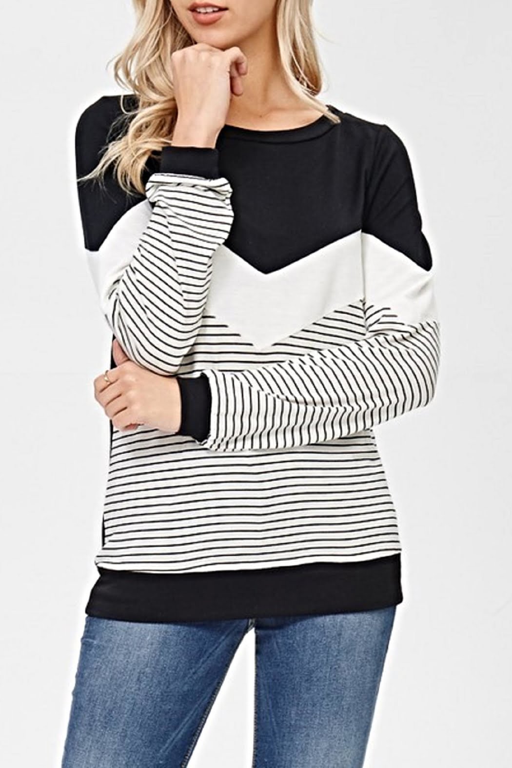 Round neck, long sleeve top with solid zig-zag stripe print.