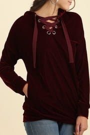 Crushed velvet hoodie with lace and grommet detail. Simple banded bottom sweatshirt body makes a casual top look luxurious. Featured in a rich wine color. This top is slightly oversized, longer in length and has two side pockets.