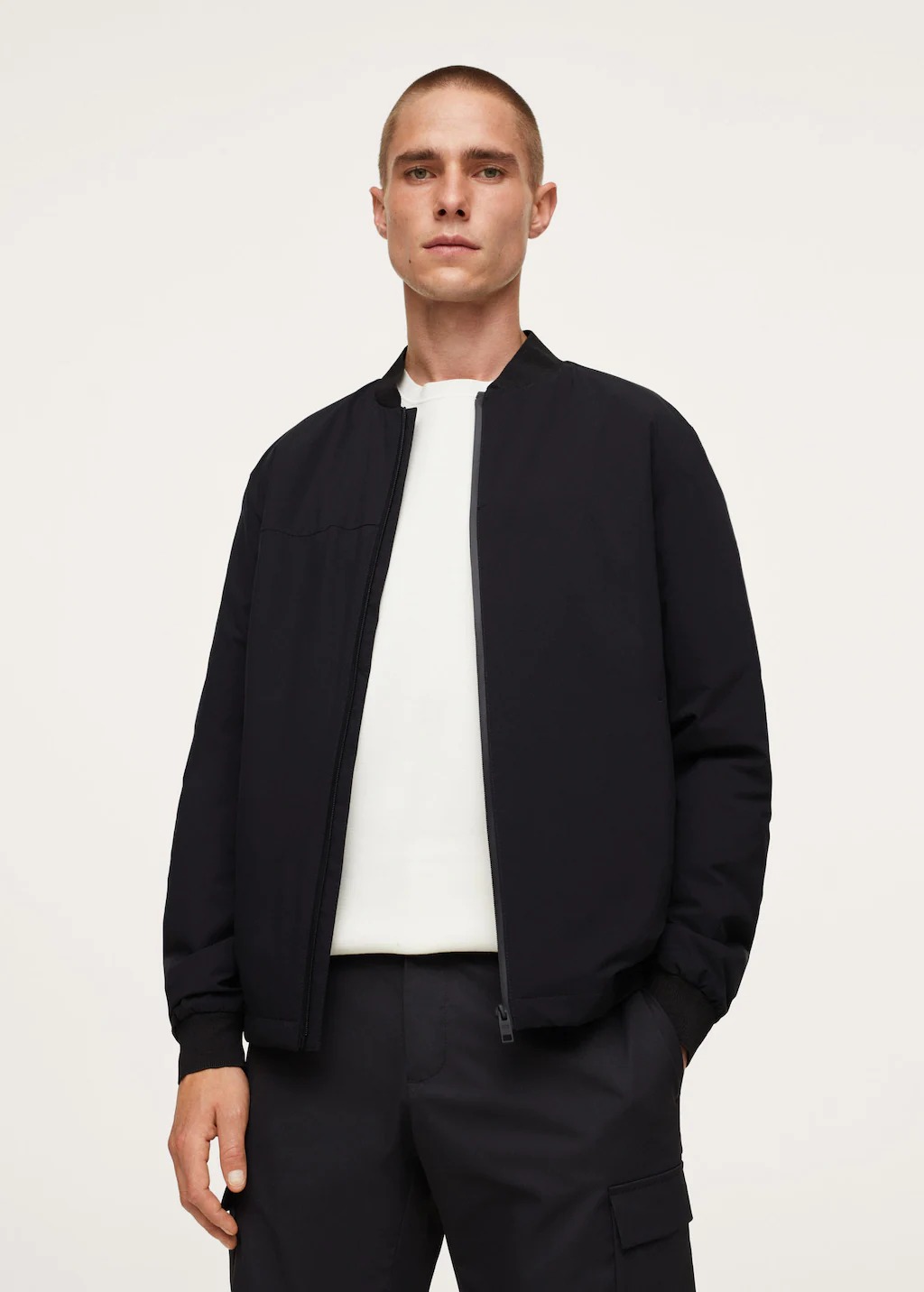 Bomber design. Stretch fabric. Water-repellent. Solotex sustainable fabric made with 37% biomass providing and ultra-soft touch with a high shape recovery. Recycled polyester padding. Short design. Bomber jacket collar. Long sleeve with elastic cuffs. Two side pockets. Zip fastening. Inner lining. Inner zipped pocket. The model is 183 cm and wears a size M.