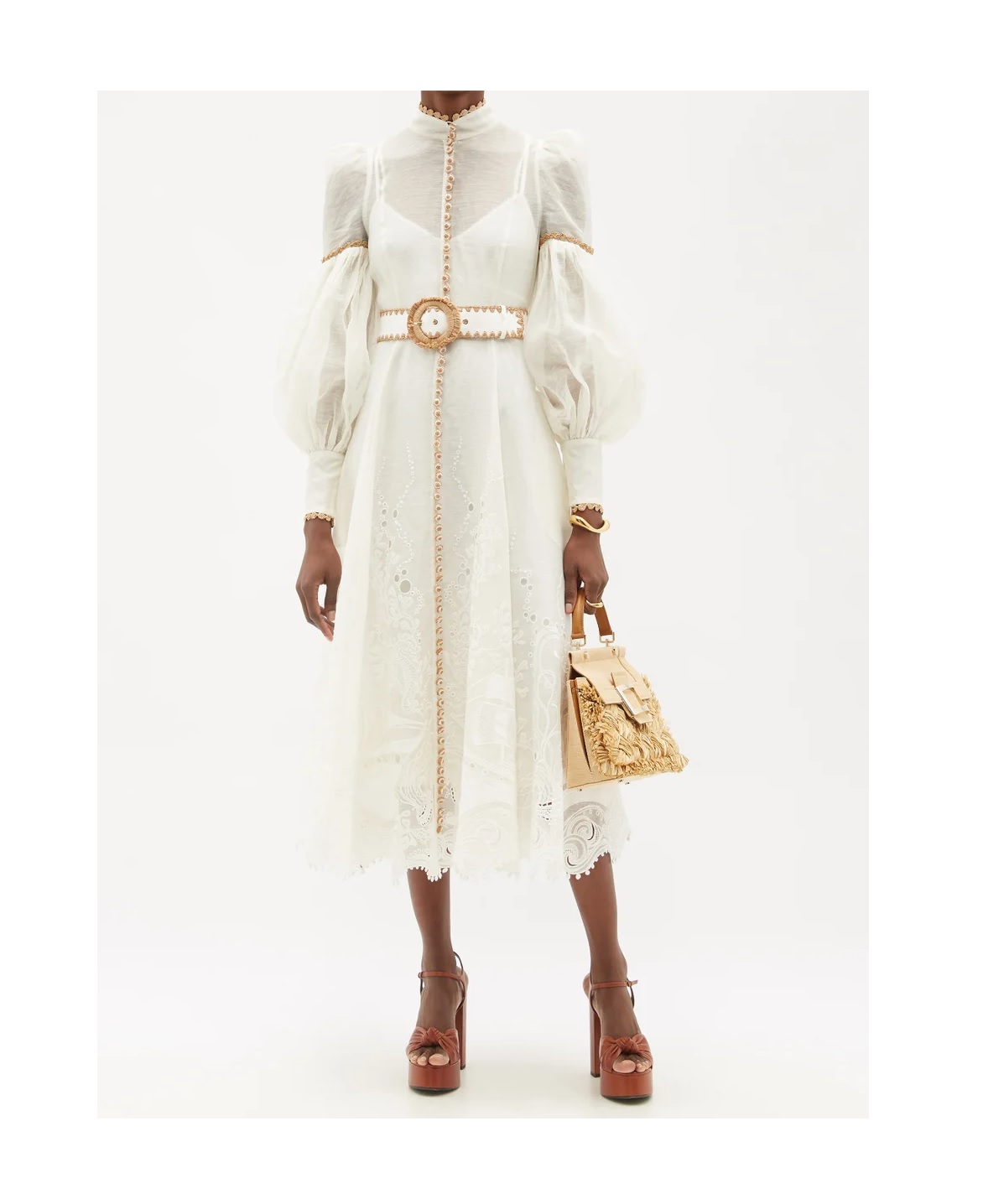 Zimmermann's white Postcard dress is crafted from linen with lantern sleeves and an adjustable belt, then embroidered with floral motifs for an ethereal touch.